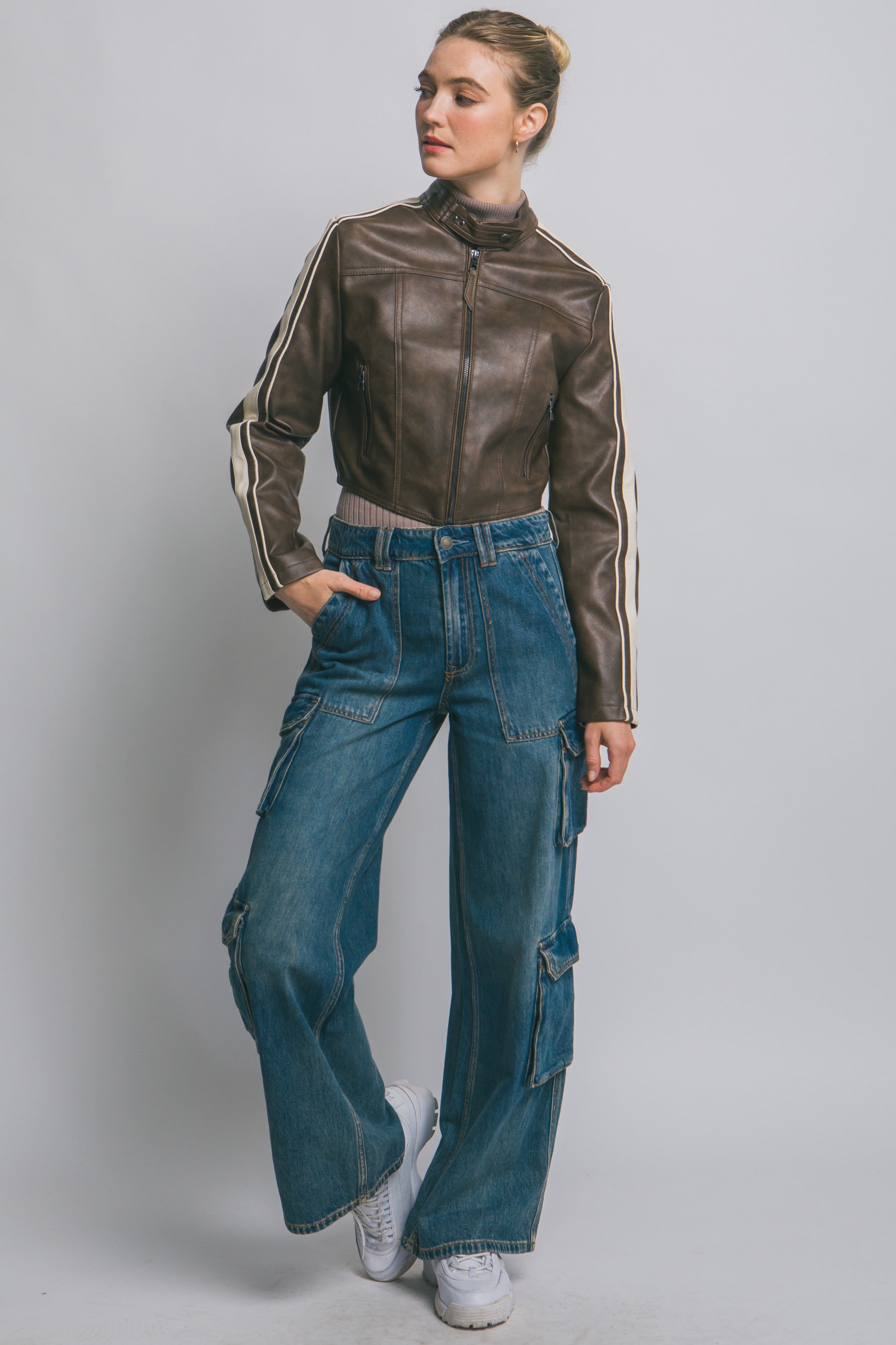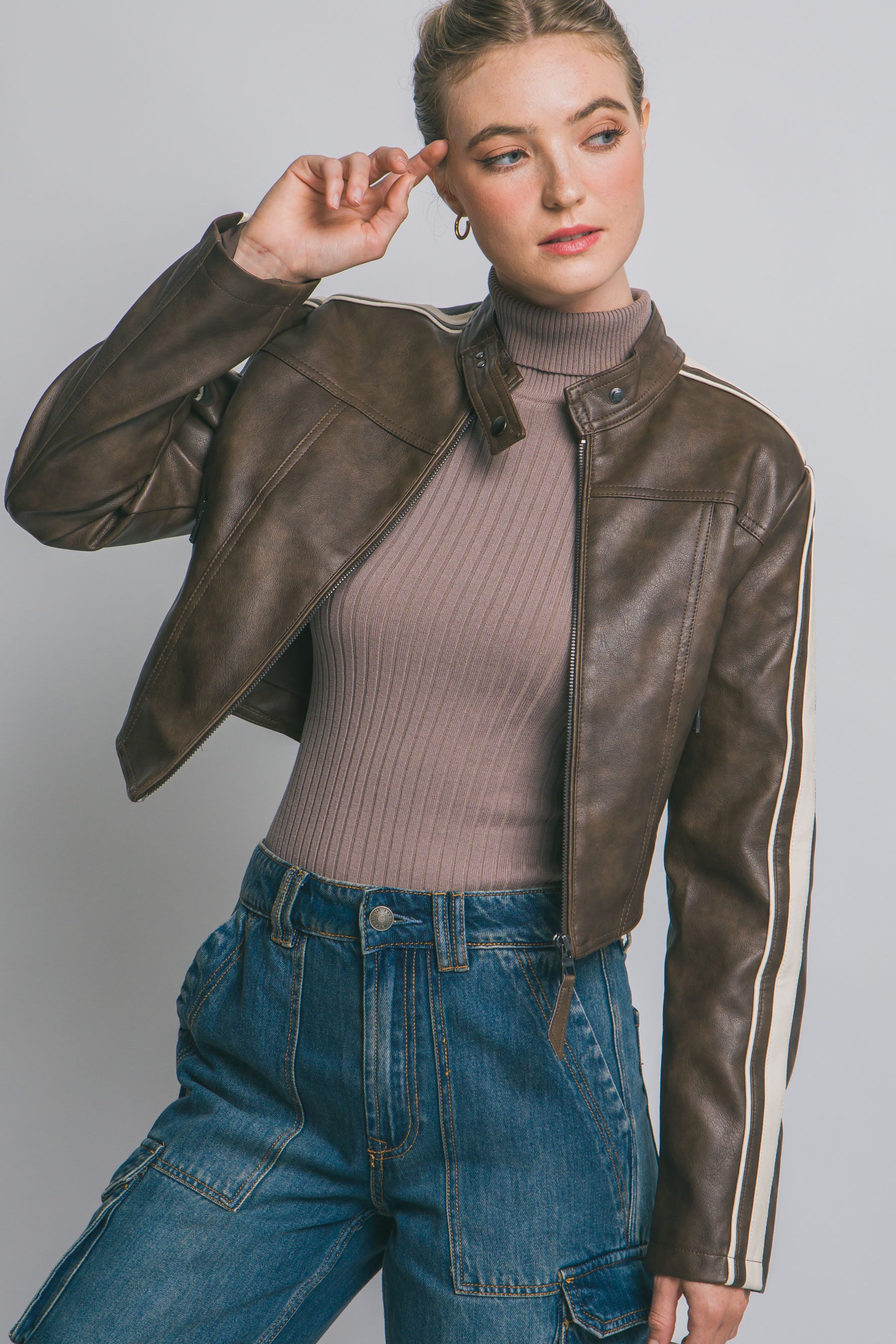 Chamarra estilo biker en eco-leather con detalle de rayas deportivas en mangas. Corte estructurado, ligero y cómodo para un look moderno y urbano.
