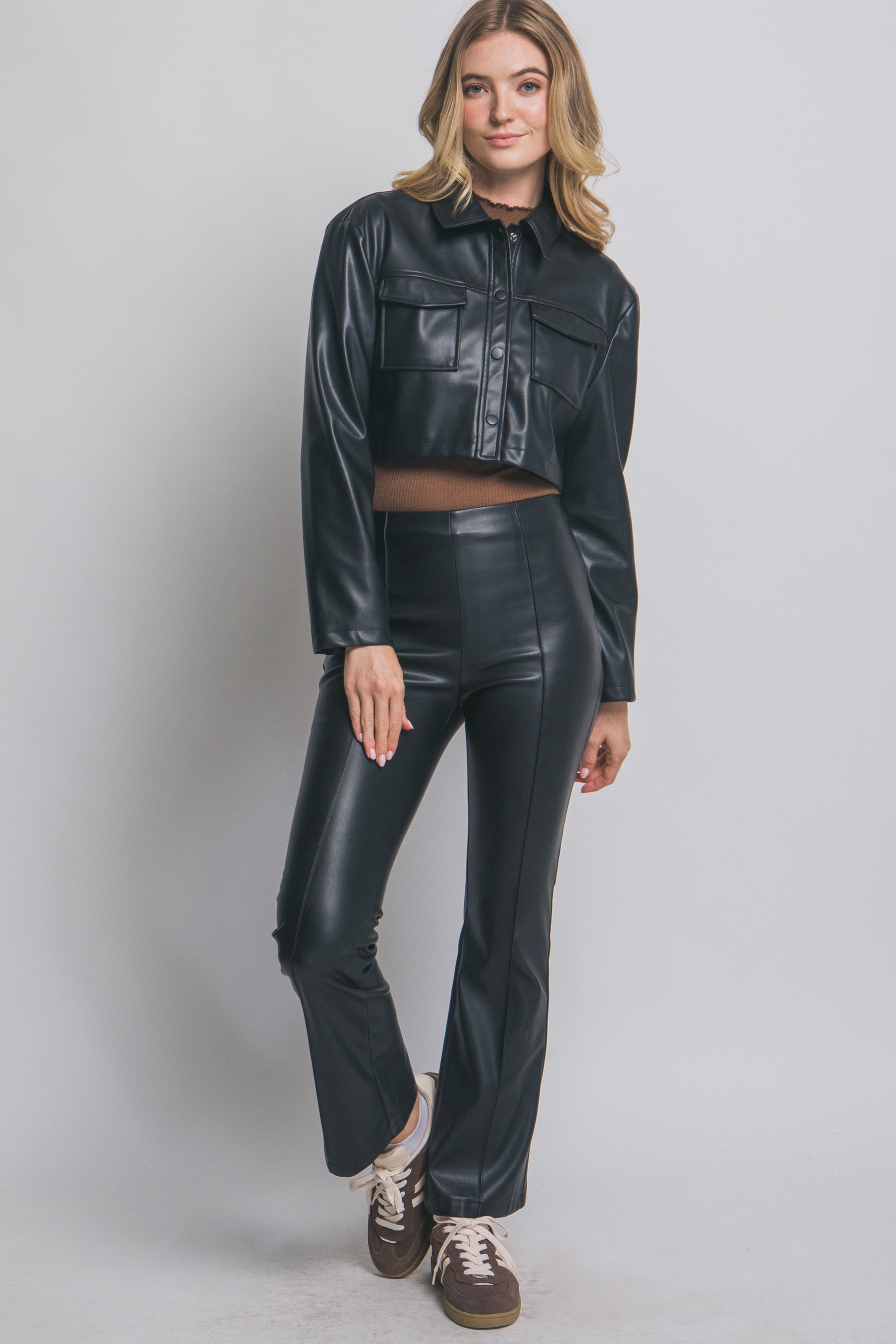 Eleva tu outfit con esta chamarra estilo crop confeccionada en piel sintética de alta calidad. Su diseño moderno incluye dos bolsillos frontales, botones al tono y un ajuste cómodo que se adapta perfecto a cualquier look. Ideal para combinar con jeans, pantalón de vestir o leggings para un estilo urbano y sofisticado.