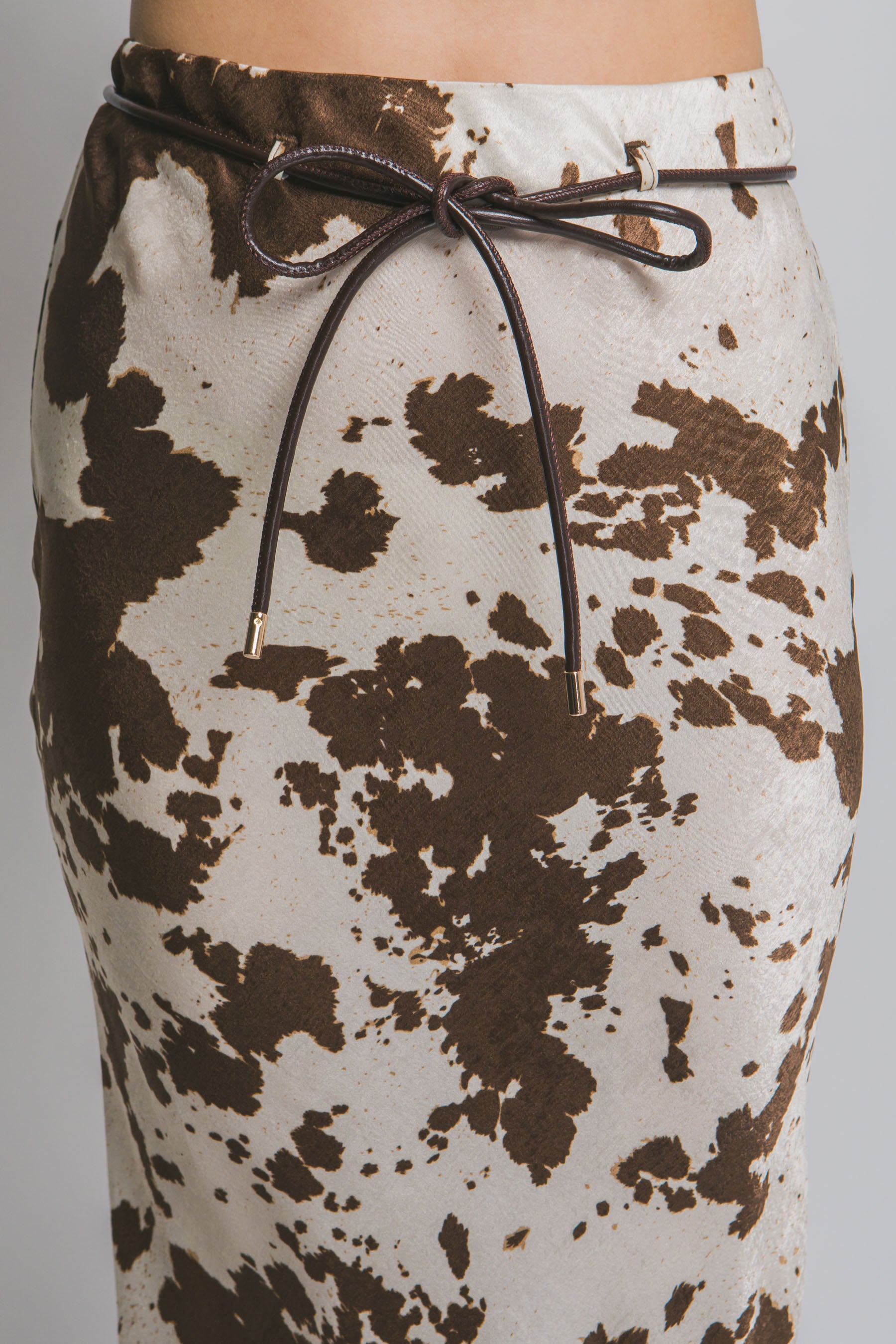 Falda midi con estampado tipo cow print en tela suave con caída ligera, acompañada de cinturón delgado tipo cordón para ajustar a la cintura. Su corte recto y largo midi estilizan la figura, creando un look sofisticado y moderno. Perfecta para combinar con botas, botín, camisa o suéter.