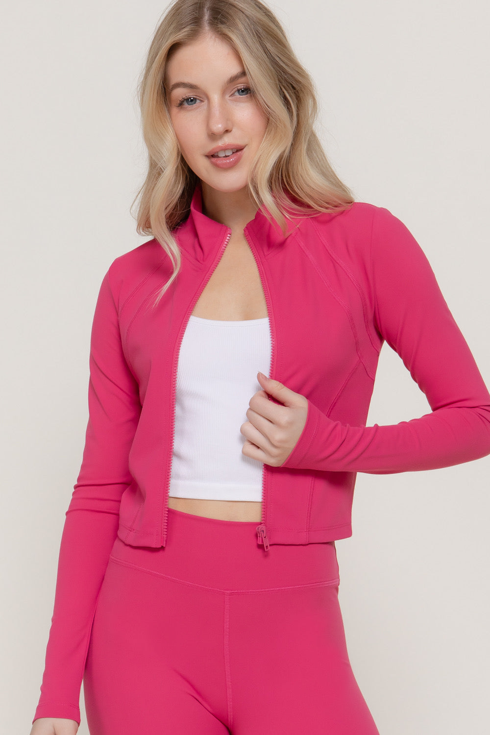 Conjunto deportivo de alto rendimiento diseñado para estilizar y brindar máxima comodidad. Incluye chamarra con cierre frontal y leggings de tiro alto que se ajustan perfectamente al cuerpo, resaltando la silueta. Su tela stretch es suave, flexible y perfecta para uso diario o entrenamiento. Ideal para un look sporty chic moderno.