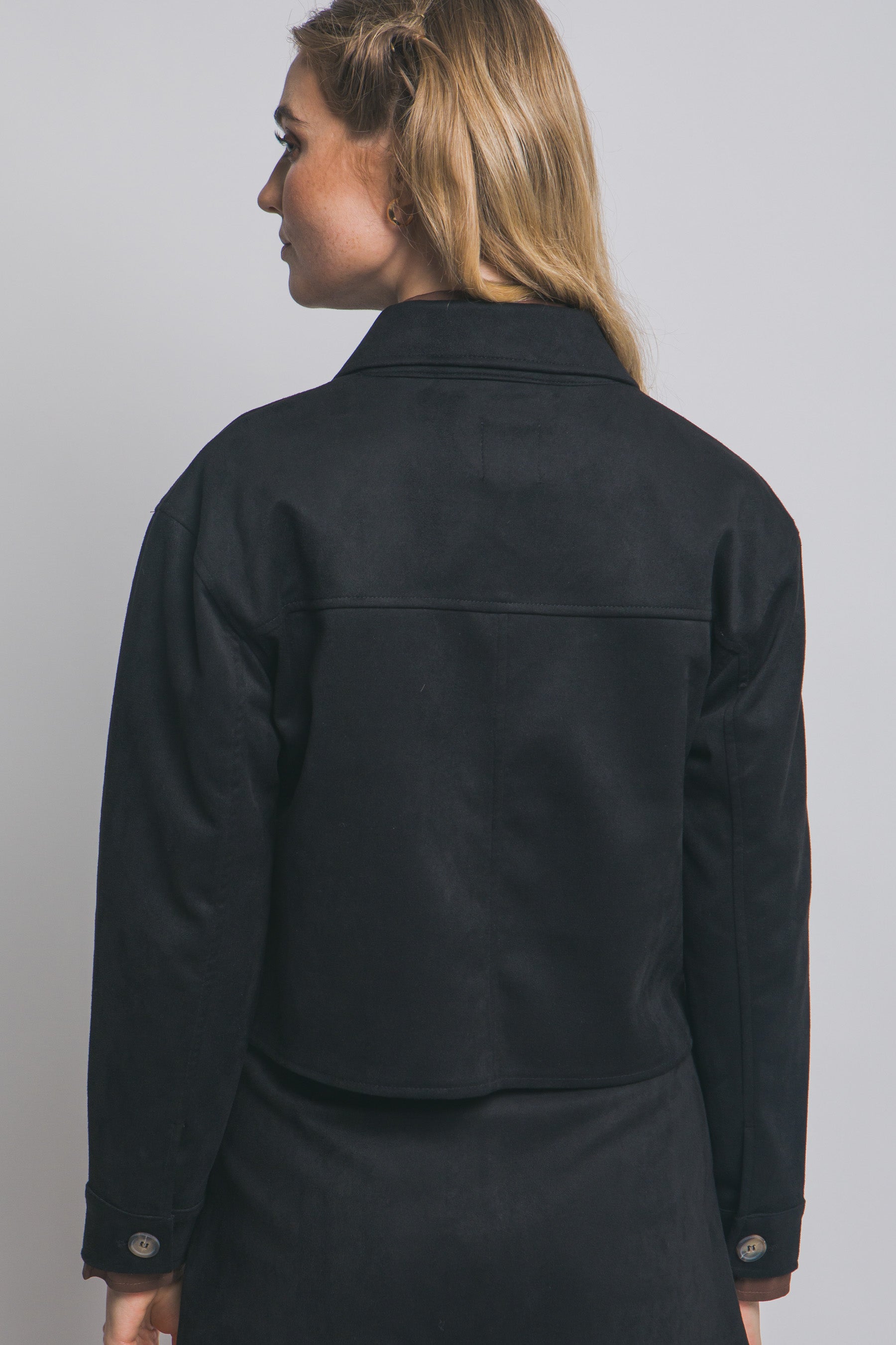 Chamarra tipo suede con textura suave al tacto y corte minimalista que aporta un estilo moderno, limpio y versátil.